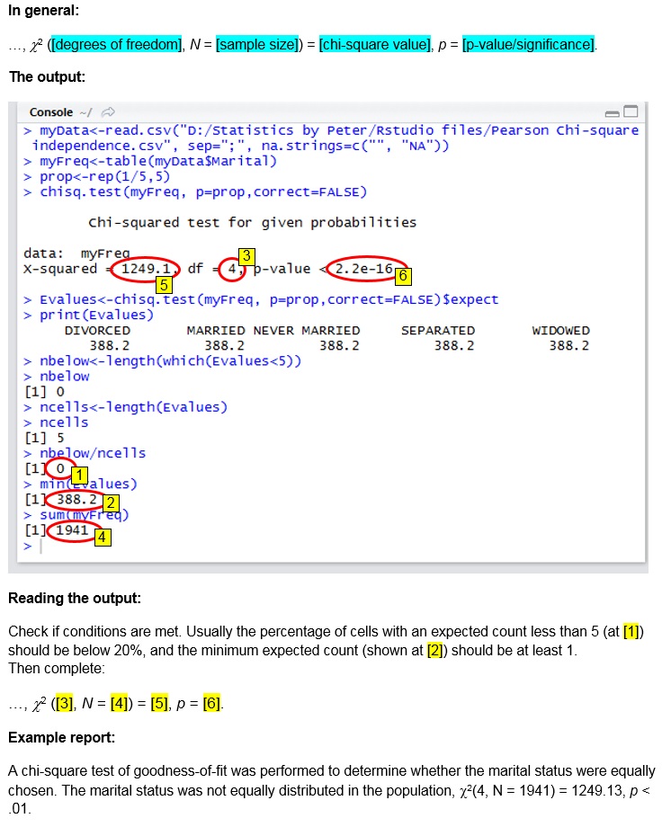 Once you have checked the conditions and looked at the results, you can report the test results. You will need the significance, but also the chi-square value itself, the sample size (number of respondents that answered this question), and the so-called degrees of freedom. This last one is simply for this test the number of categories minus 1. In the example the percentage of cells with an expected count less than 5 is actually 0%, so it is okay to use the test. The test results showed that the sig. was .000. This indicates it was less than .0005 and is then often reported simply as < .001. We had five categories, so the degrees of freedom is 5 – 1 = 4, the sample size was 1941 and the chi-square value (calculated by the software) was 1249.13. The test results could then be reported as something like