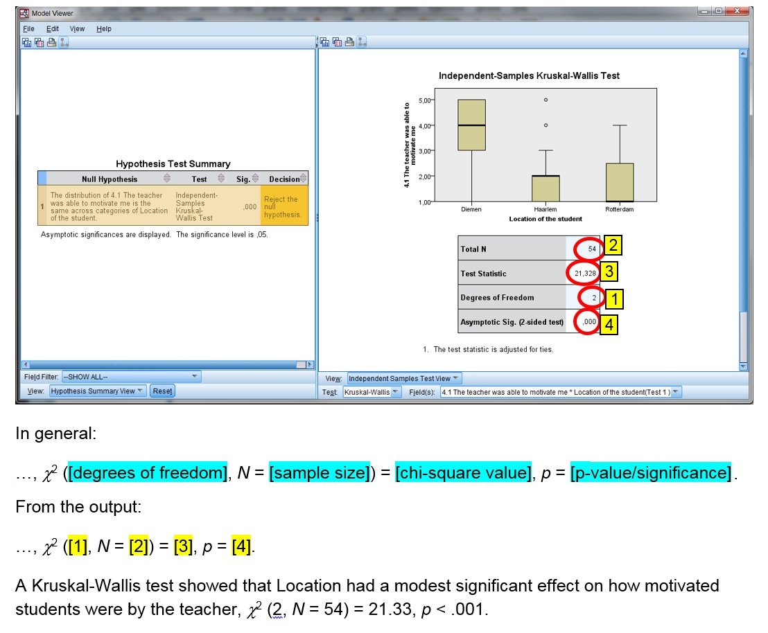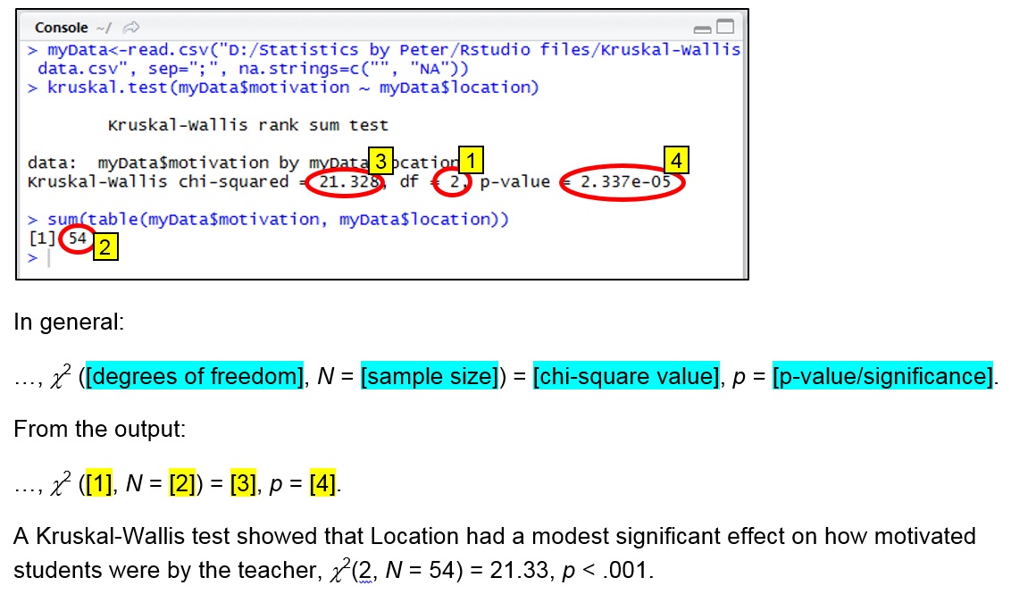 Note that the Kruskal-Wallis test eventually uses a chi-square distribution, which is why the χ2 is shown.