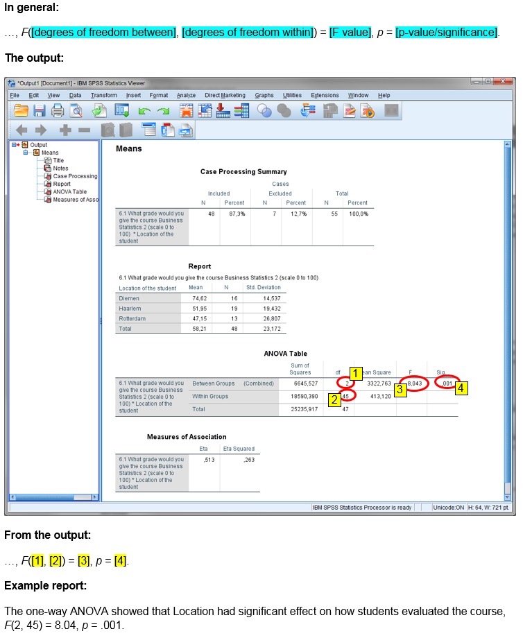 In the example the significance is 0.001, which is the chance of having a sample with a F value of 8.043 or even higher, if in the population there would be no differences between the three groups. Since this chance is so low (below 0.050), we can conclude that most likely in the population there will be a an influence of the location on the grade students gave.